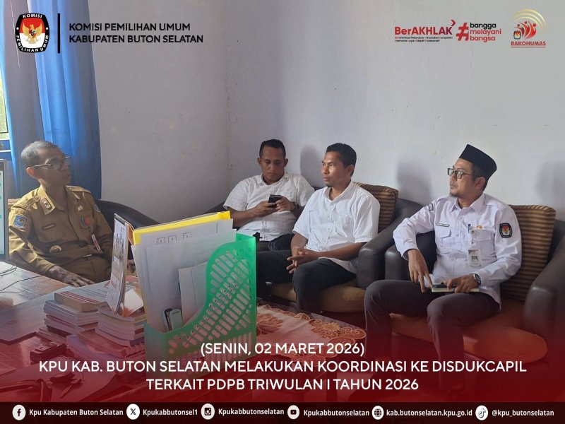 Batauga, Kab-Butonselatan.go.id- Dalam upaya menjaga kualitas dan akurasi data pemilih di Kabupaten Buton Selatan, KPU Kabupaten Buton Selatan melakukan kunjungan koordinasi ke Dinas Kependudukan dan Pencatatan Sipil (Disdukcapil) Kabupaten Buton Selatan pada Senin, 02 Maret 2026. Kegiatan ini dipimpin langsung oleh Ketua KPU Kabupaten Buton Selatan, dan dibersamai oleh Ketua Divisi Perencanaan Data dan Informasi didampingi Ketua Divisi Hukum & Pengawasan, Plt. Sekretaris ,Kasubag dan staf Sekretariat KPU Kabupaten Buton Selatan. Pelaksanaan koordinasi antara KPU Kabupaten Buton Selatan dan Disdukcapil merupakan langkah krusial untuk menjaga kualitas, akurasi, dan kemutakhiran data pemilih pada masa tahapan Pemutakhiran Data Pemilih Berkelanjutan (PDPB) Tahun 2026. Substansi utama dari kegiatan ini adalah untuk mematangkan persiapan teknis pelaksanaan Pencocokan dan penelitian Terbatas (Coktas) serta membangun mekanisme pertukaran informasi yang efektif terhadap berbagai kategori data kependudukan. Sinergitas antarlembaga ini menjadi fondasi penting dalam mewujudkan data pemilih yang komprehensif dan akurat, yang pada akhirnya akan menjamin hak pilih setiap warga negara di Kabupaten Buton Selatan sesuai dengan amanat Undang-Undang Nomor 7 Tahun 2017 #TemanPemilih #KPUBusel #KPUMelayani ....